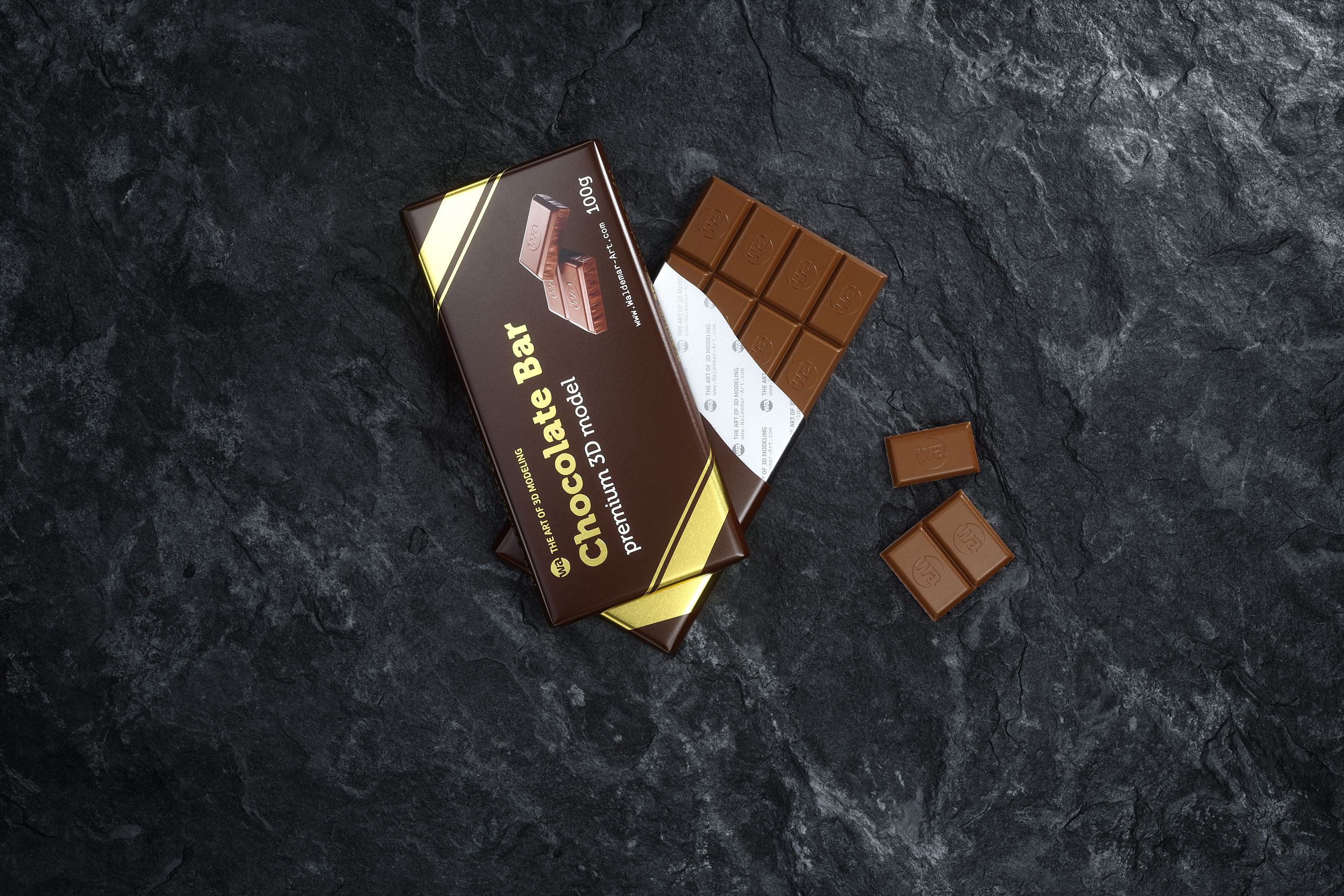 High-quality 3D model of Chocolate Bar 100g wrapped in Foil and Paper with close and open packaging, designed for realistic bar packaging visualization and close-up rendering.