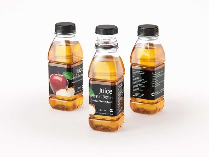 Juice PET Plastic Bottle 330ml packaging 3D model pak with closure and label.